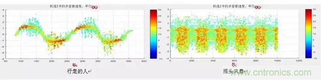 圖3:兩張圖顯示了行走的人和擺頭風(fēng)扇隨時(shí)間推移的微多普勒信息