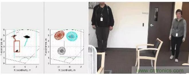 圖4:使用毫米波傳感器執(zhí)行分類的示例:中間圖上所有移動(dòng)目標(biāo)都分配了一個(gè)軌道,彩色區(qū)域表示人