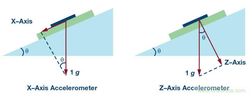 如下圖,坡度角θ。下圖左邊,檢測軸X軸垂直于重力平面(坡度為0時),此時加速度傳感器的輸出Ax=sin(θ)*1g。下圖右邊,檢測軸Z軸平行于重力平面(坡度為0時),此時加速度傳感器的輸出Az=cos(θ)*1g。