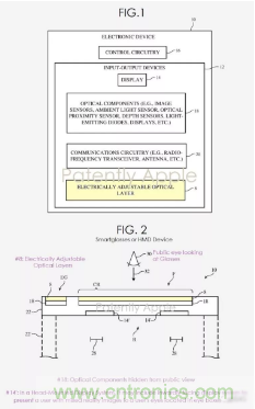 蘋果公司希望通過此專利推進(jìn)其在可調(diào)節(jié)光學(xué)層上的技術(shù)發(fā)展。此發(fā)明支持使用者對(duì)智能眼鏡的光學(xué)層進(jìn)行模式調(diào)節(jié),例如按照個(gè)人喜好調(diào)整光學(xué)層的明暗。下圖1是具有光學(xué)組件和電可調(diào)光學(xué)層的電子設(shè)備示意圖;下圖2是頭戴式設(shè)備采用電可調(diào)光學(xué)層(#8)的示意圖。