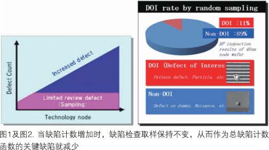 半導(dǎo)體制造中廣泛采用晶圓自動(dòng)檢測系統(tǒng)已逾30年。在線晶圓檢測有助于推進(jìn)制造技術(shù)的發(fā)展,它能早期檢測到工藝中的缺陷,從而減少開發(fā)時(shí)間并防止產(chǎn)出超時(shí)。過去,檢測缺陷的能力是主要關(guān)注點(diǎn)之一,但現(xiàn)在的要求改變了。近幾年來,每一晶圓的缺陷計(jì)數(shù)迅速增長至每一晶圓多達(dá)100萬個(gè)缺陷,這是因?yàn)榫A尺寸變大,同時(shí)檢測技術(shù)靈敏度更高了(圖1)。雖然總檢測計(jì)數(shù)增加及關(guān)鍵缺陷尺寸變得更小,這一時(shí)期缺陷檢查的典型策略并未改變,尤其是在隨機(jī)取樣占主導(dǎo)的缺陷檢查區(qū)域。這種情況能產(chǎn)生常與干擾缺陷在一起的缺陷pareto圖(圖2)。