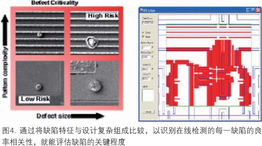 為了提高監(jiān)測和識別關(guān)鍵缺陷的效率,必須采用新方法。依賴簡單的缺陷過濾和基于大小的缺陷次序是不夠的。為了取得最佳的檢測和鑒評預(yù)算,必須對檢測設(shè)置與鑒評策略二者使用新的知識信息。從設(shè)計(jì)和模擬得到的關(guān)鍵區(qū)域和熱點(diǎn)這樣一些知識信息可以插入檢測方略中,優(yōu)化可用的檢測容量。在完成檢測過程中和完成后,基于多重檢測結(jié)果的缺陷過濾和分類使用戶能快速識別新缺陷,有效地量化已知的缺陷類型。利用設(shè)計(jì)空間中缺陷鄰近位置的信息(此處,設(shè)計(jì)的復(fù)雜組成是了解的),可以較好地評估每一缺陷的良率相關(guān)性,提供缺陷的排序(圖4)。
